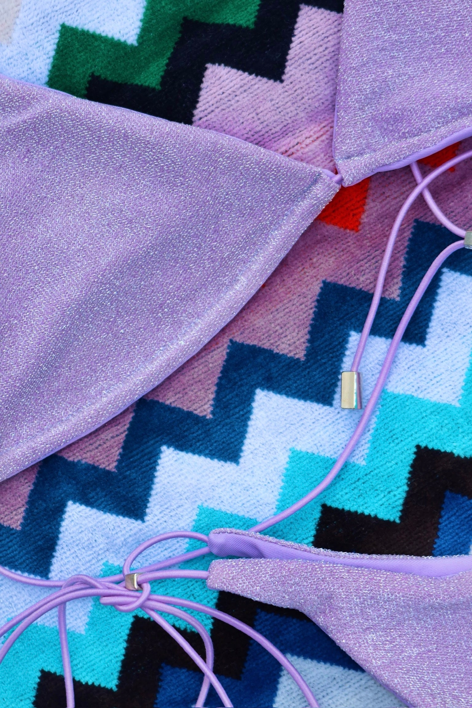 Expertly crafted for your next summer holiday. Effortlessly shine with our Pastel Purple Bikini Top! Crafted from a shimmery, baby purple and double lined with a silky fabric for comfortability. This top is the ultimate show stopper! Designed with a classic triangle adjustable shape, also features adjustable beads and thin spaghetti tie strings ensure a secure fit with minimal tan lines.